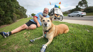 They stopped often, exhausted, and Brendon considered sending Jojo back home to Geelong. But Brendon was determined to keep this trek going and soon they hit their stride. The pair started to average an epic 20kms a day with Jojo now sporting some pretty groovy looking booties to help protect her paws. They made headlines along the way, collecting funds for cancer research through each of the Australian towns they visited.